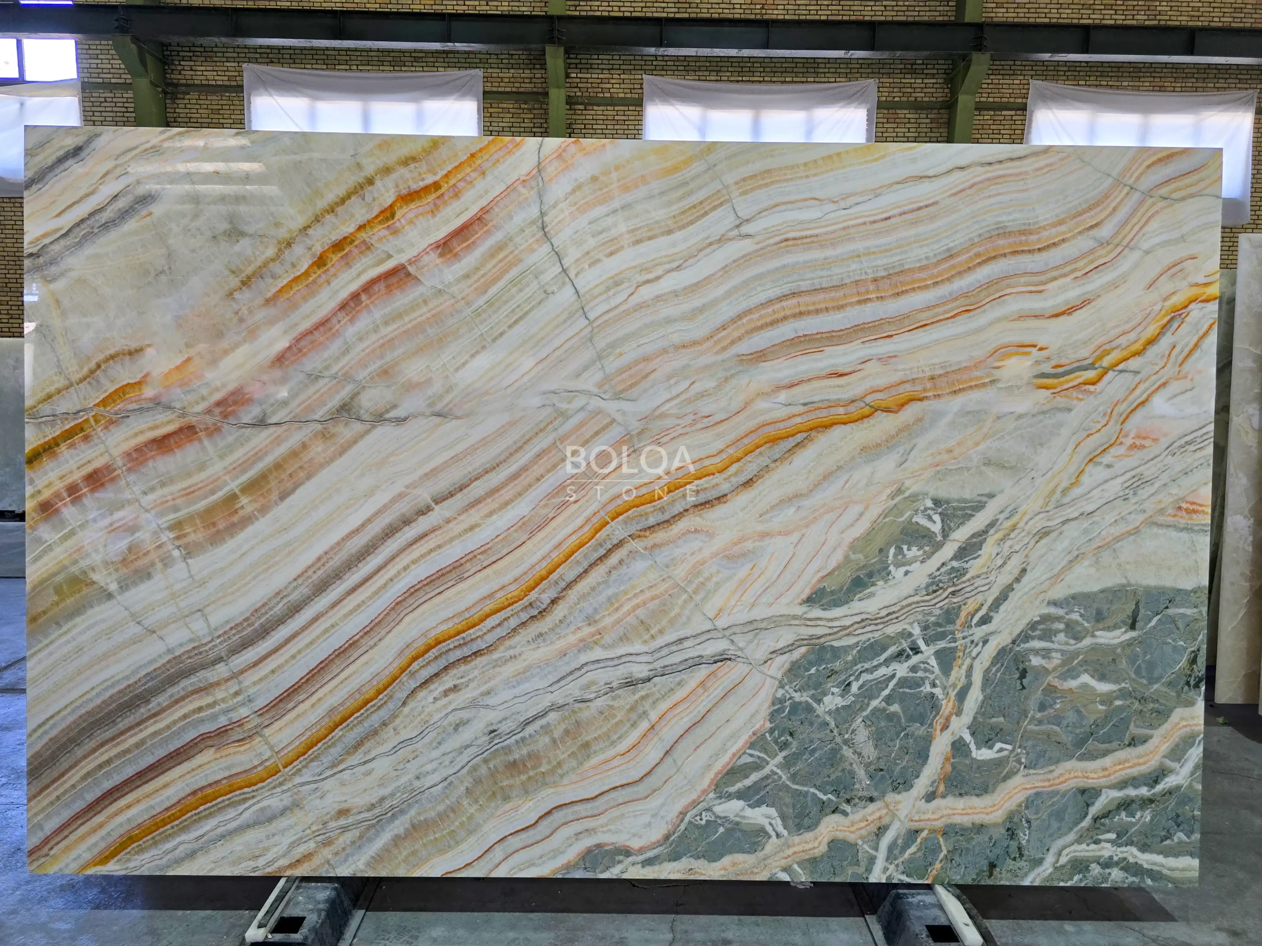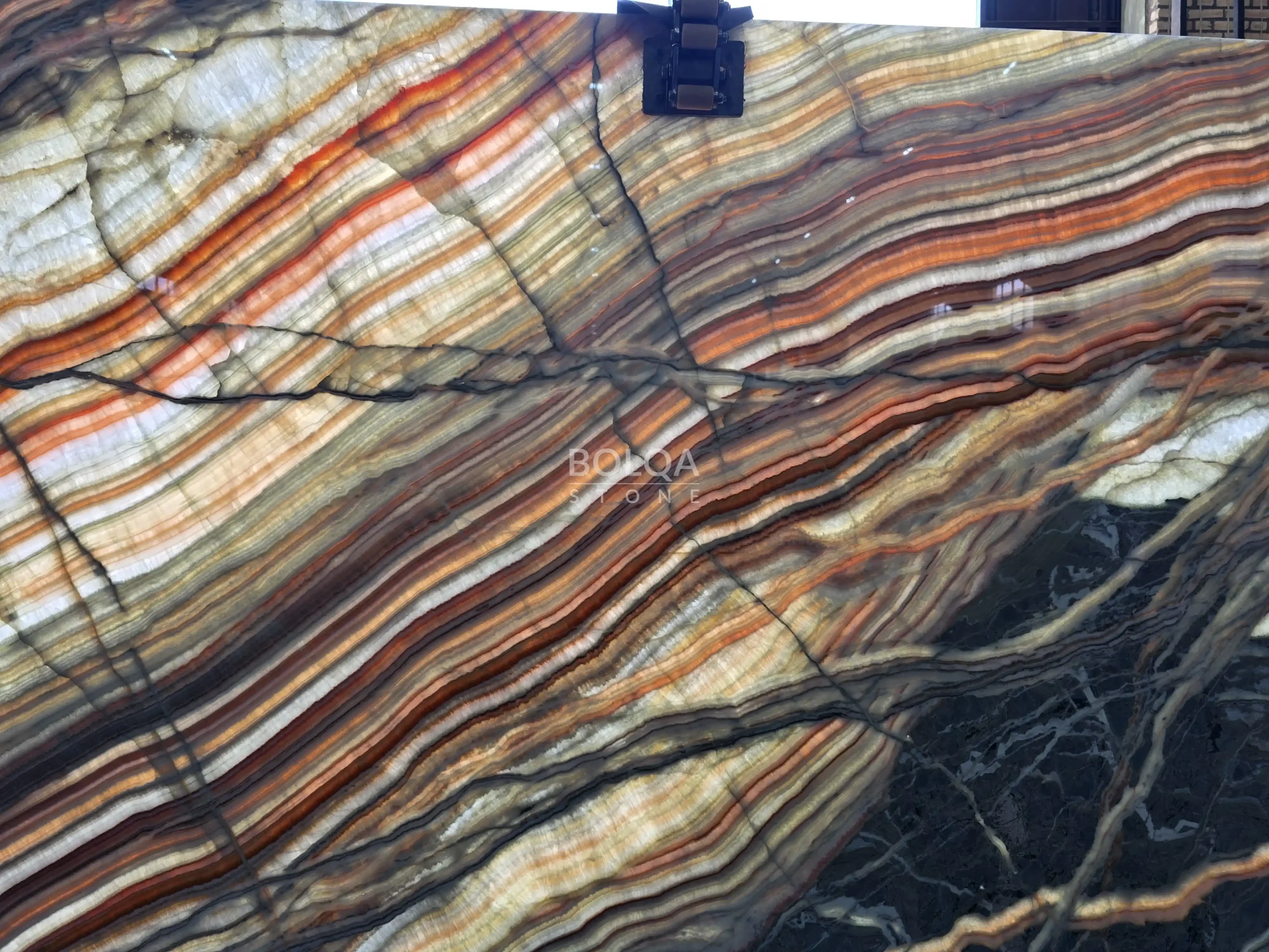 Origin: Iran. BOLQA Stone Group sources Rainbow Onyx directly from Iranian quarries and fabricates to international standards with meticulous selection and bundle matching.