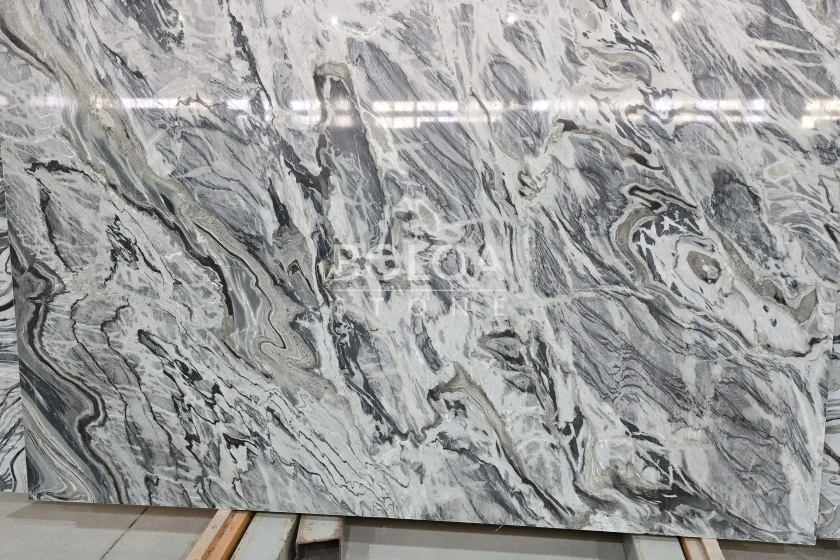 Silver Stream is an Iranian gray marble with dramatic, flowing veining. Supplied as slabs, tiles, and blocks in Polished, Honed, and Rock Design finishes—exported worldwide by BOLQA.