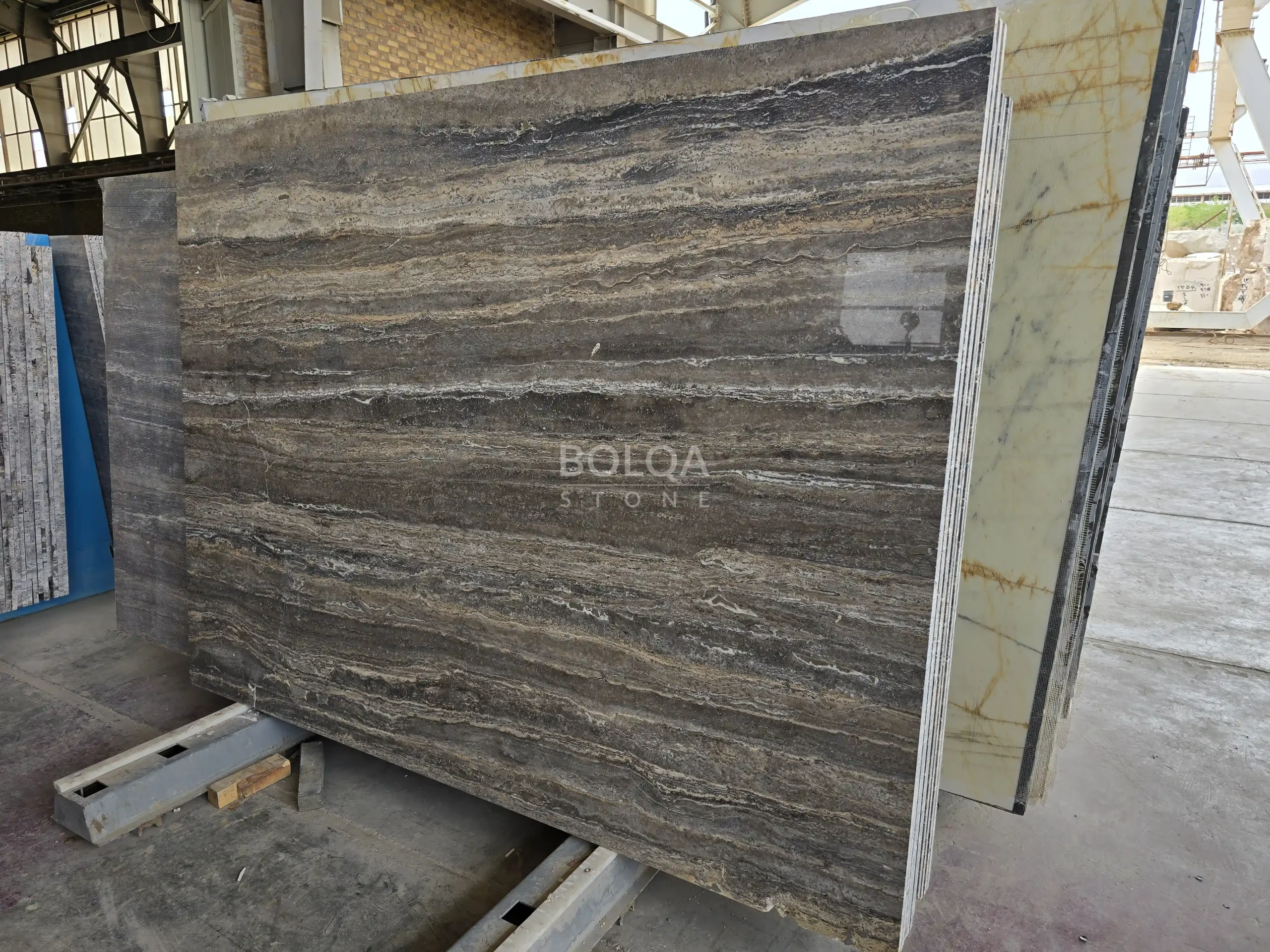 Silver Travertine (Maktoob) from Iran showcases refined silver-grey banding and natural travertine texture. Available as slabs, tiles, and blocks, it suits high-end interiors, façades, and outdoor areas. A consistent, elegant choice for international wholesale projects.