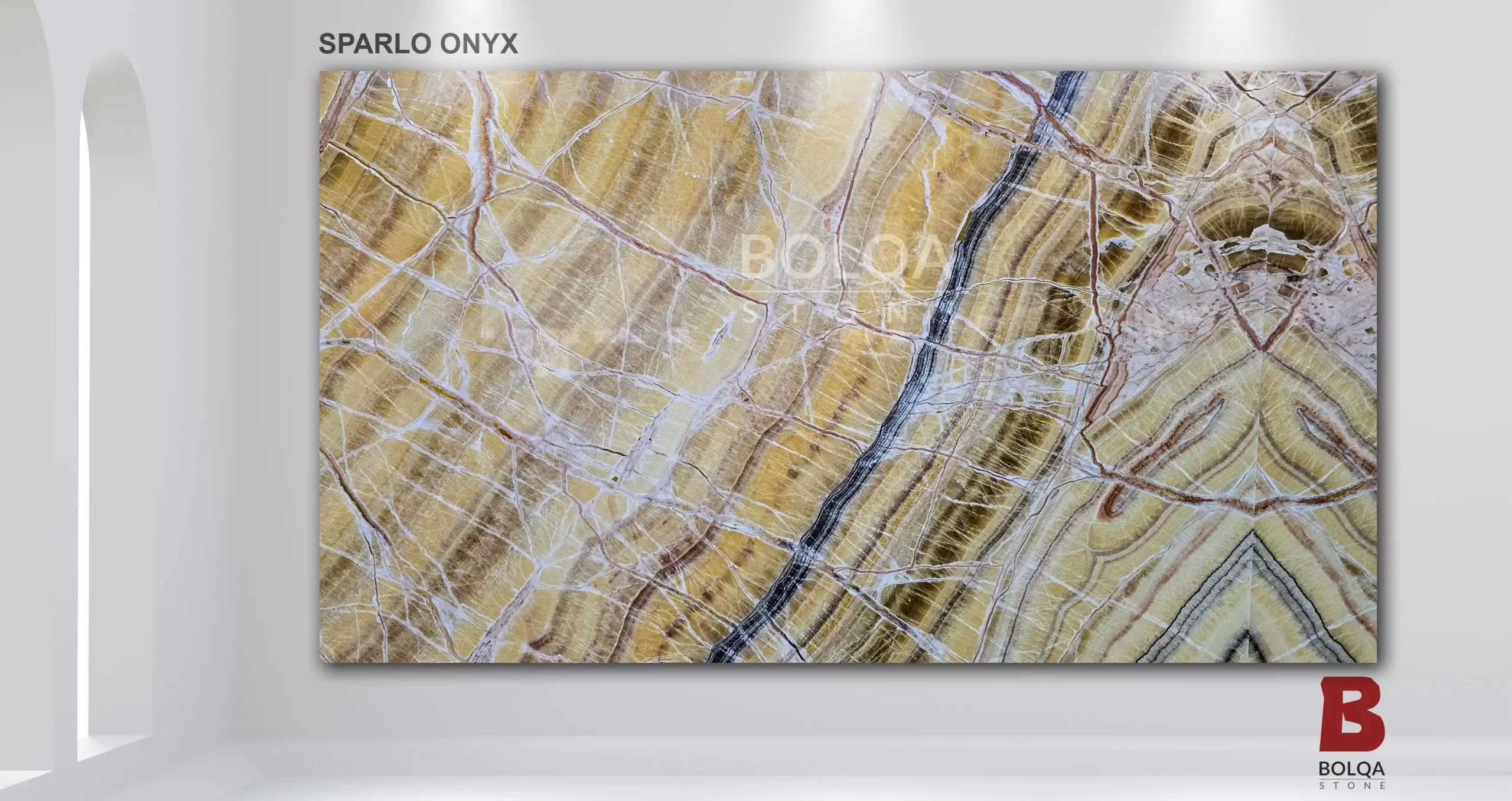 Sparlo Onyx is a radiant Iranian stone featuring a warm golden-yellow field with soft white clouding and refined amber veining. Its natural translucency makes it ideal for illuminated focal walls and luxury interiors. Explore more in our yellow onyx collection. As an experienced Iranian stone exporter and wholesale onyx supplier, BOLQA Stone Group delivers project-ready materials for international specifications.